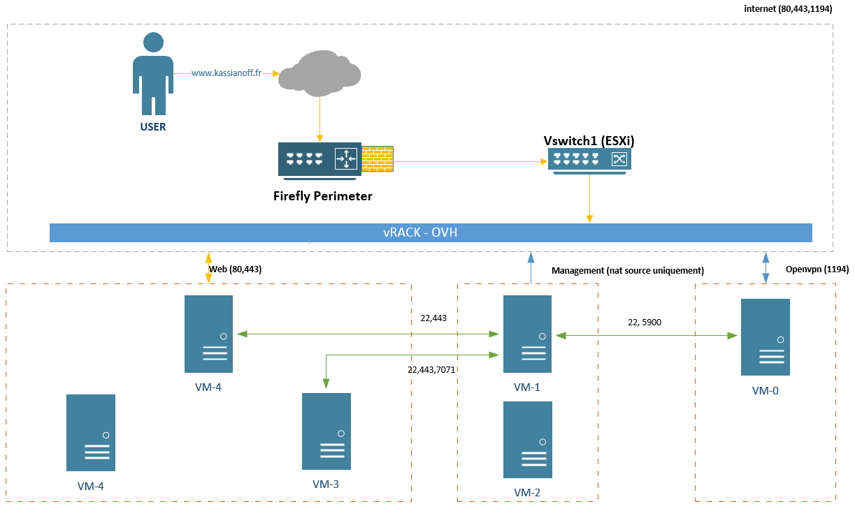L’infrastructure virtuelle aura un accès vers l’internet via un bloc-rip fournit par OVH et sera constituée de 3 réseaux LAN distincts.