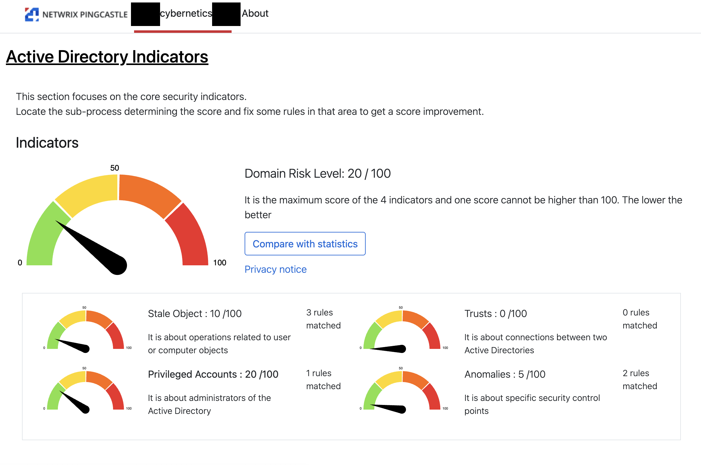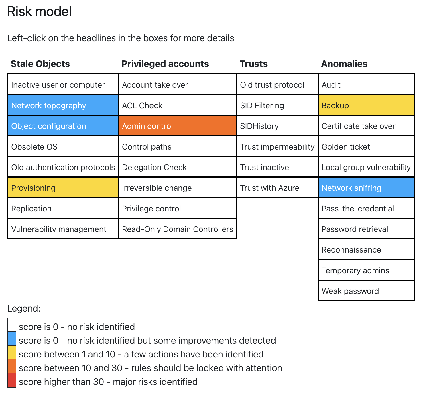 PingCastle développé initialement par Vincent Le Toux et racheté par Netwrix, propose une approche méthodologique basée sur un modèle de risque à 4 catégories principales, avec 186 règles de contrôle détaillées disponible au lien suivant.