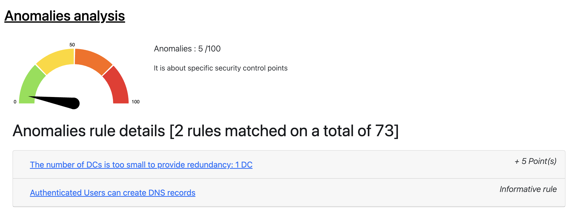 Ici encore ses anomalies peuvent être corrigées selon les procédures recommandées pour améliorer le score de sécurité. Une interruption planifiée été jusqu'ici acceptable pour la restauration du DC principal. Le déploiement d'un second contrôleur de domaine physique s'impose si nous souhaitons assurer la redondance.