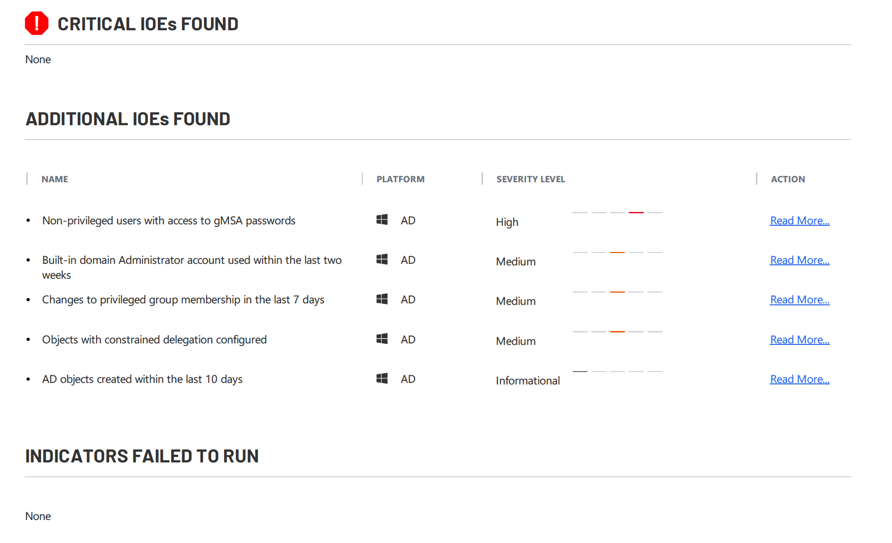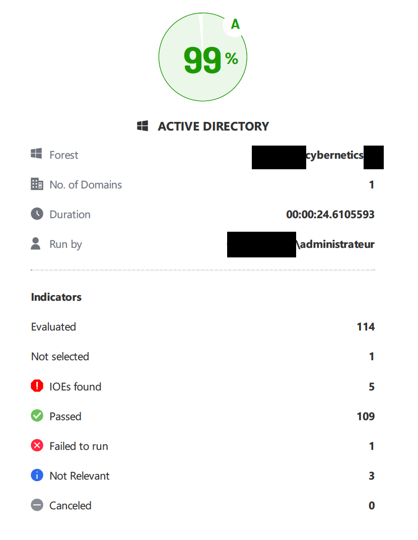 Purple Knight, développé par Semperis, effectue un scan complet de l'environnement AD à la recherche d'Indicateurs d'Exposition (IoE) et d'Indicateurs de Compromission (IoC). L'outil propose environ 185 contrôles de sécurité répartis en plusieurs catégories disponibles sur le lien suivant.