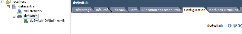 Pour ce faire : rendons-nous dans Page d’accueil/Inventaire/Mise en réseau puis sur le dvSwitch et dans l’onglet configuration :
