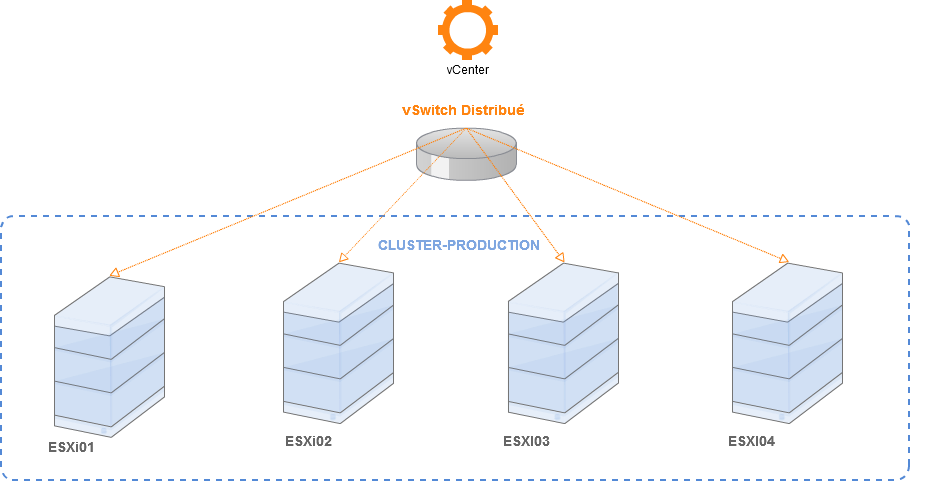 Dans une infrastructure vCenter, la gestion du réseau est primordiale et il peut donc être intéressant d’utiliser les commutateurs virtuels distribués (dvSwitchs). Ils auront, comme leur nom l’indique, la fonction de distribuer le réseau à l’ensemble des hôtes ESXi. Ainsi un vSwitch devient un dvSwitch et un portgroup devient un dvports. Dans le cas présent, nous déploieront un unique vSwitch distribué à l’ensemble de nos hôtes sans migration de VM (voici un exemple) :
