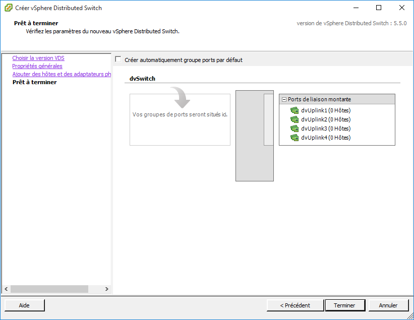 De plus nous n’ajoutons aucun dvport donc décochons créer automatiquement groupe ports par défaut :