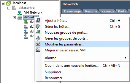 Pour ce faire il faut faire un clic droit sur le dvSwitch et l’option Modifier les paramètres :