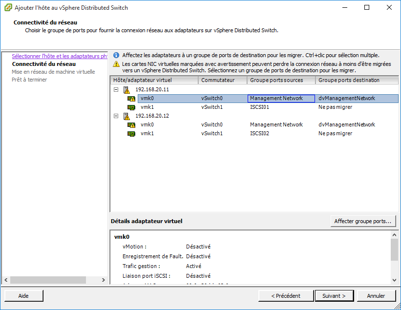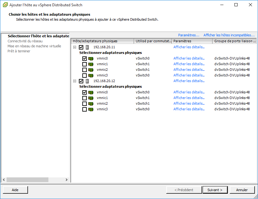 Nos deux hôtes devront être sélectionnés ainsi que la carte vmnic0 :