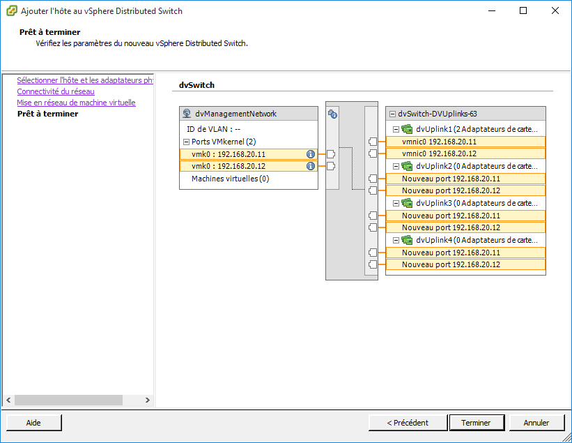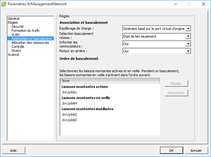 Info : DvUplink1 correspond à vmnic0 et dvUplink4 à vmni3.