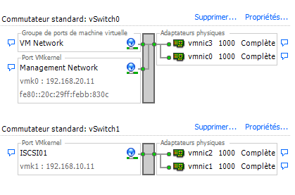 Un vSwich1 composé d’un portgroup : ISCSI avec 2 cartes (vmnic1 et vmnic3) déjà configuré en multipathing.