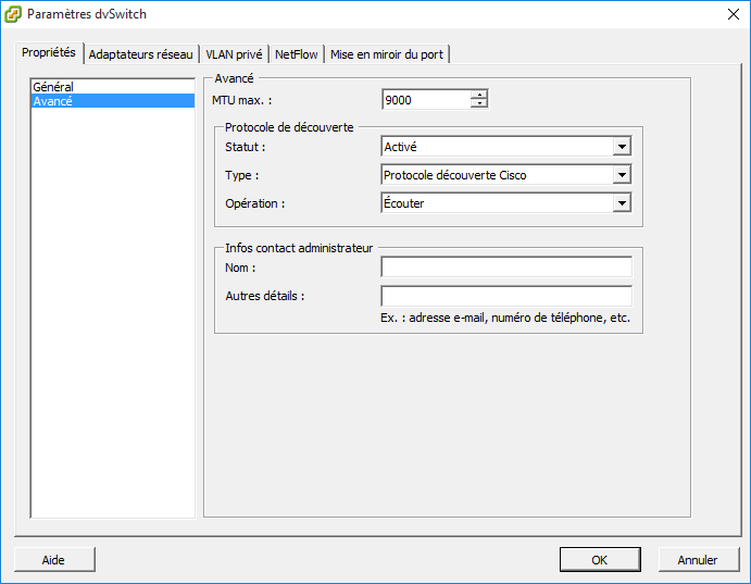Une fois dans les options nous sélectionnons Avancé puis MTU à mettre à 9000 :